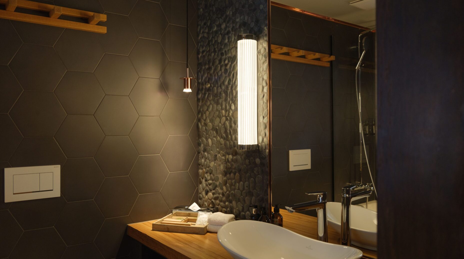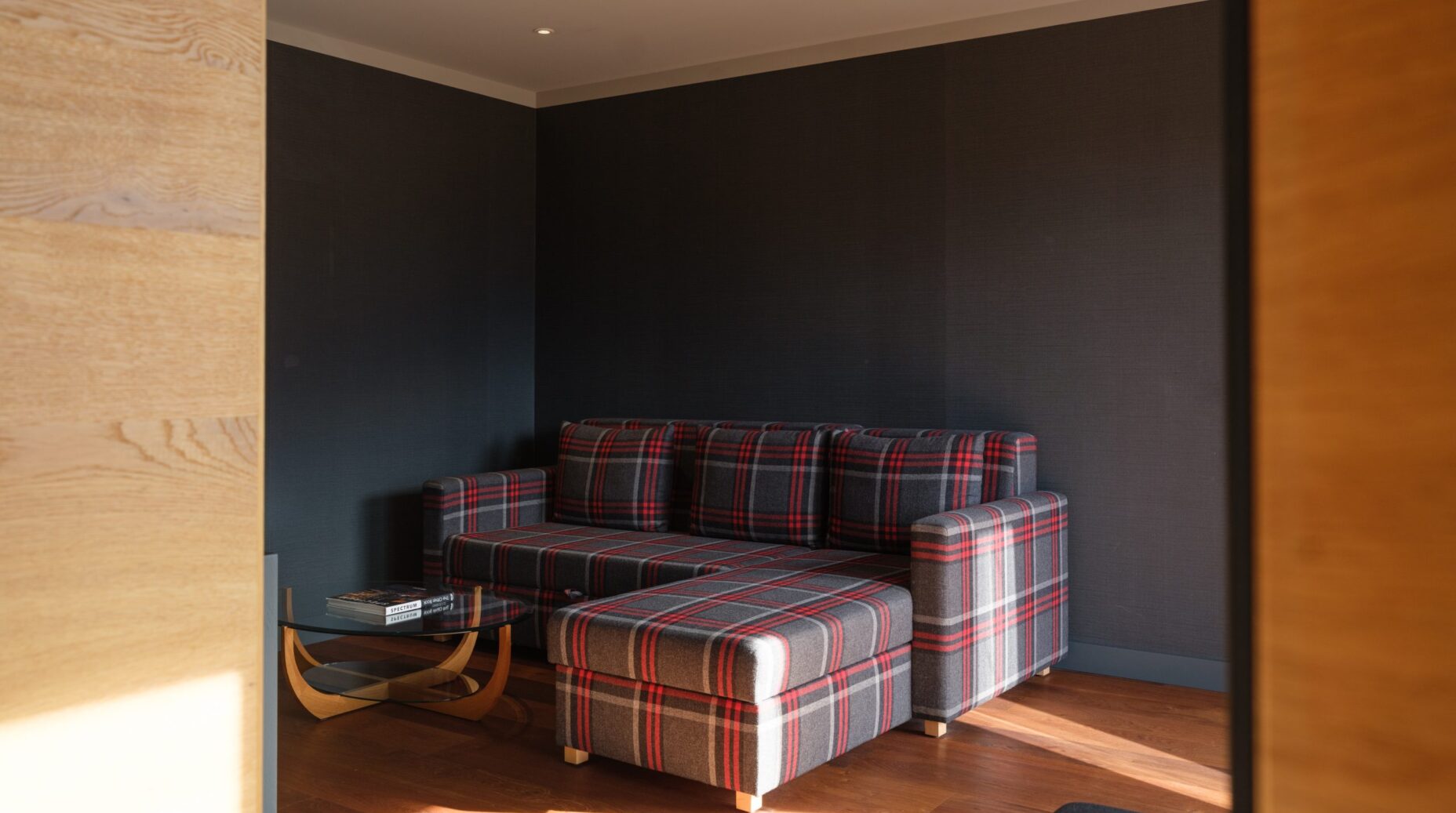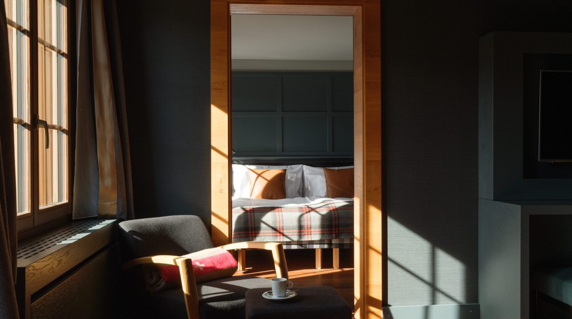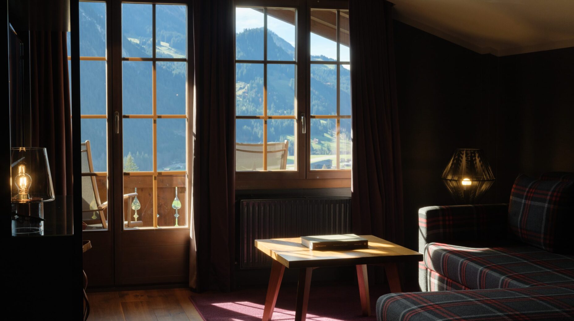 Each suite stands out for its unique charm, combining traditional Swiss elements with a modern style. Our suites are generously sized, allowing guests to move comfortably and relax in a luxurious setting. The private lounge area is furnished with plush sofas and homey blankets, making it the perfect spot to relax in the cozy HUUS Gstaad atmosphere.